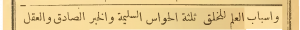 وَأَسْبَابُ الْعِلْمِ لِلْخَلْقِ ثَلَاثَةٌ : الحَوَاسُّ السَّلِيمَةُ ، وَالْخَبَرُ الصَّادِقُ ، والعَقْلُ .